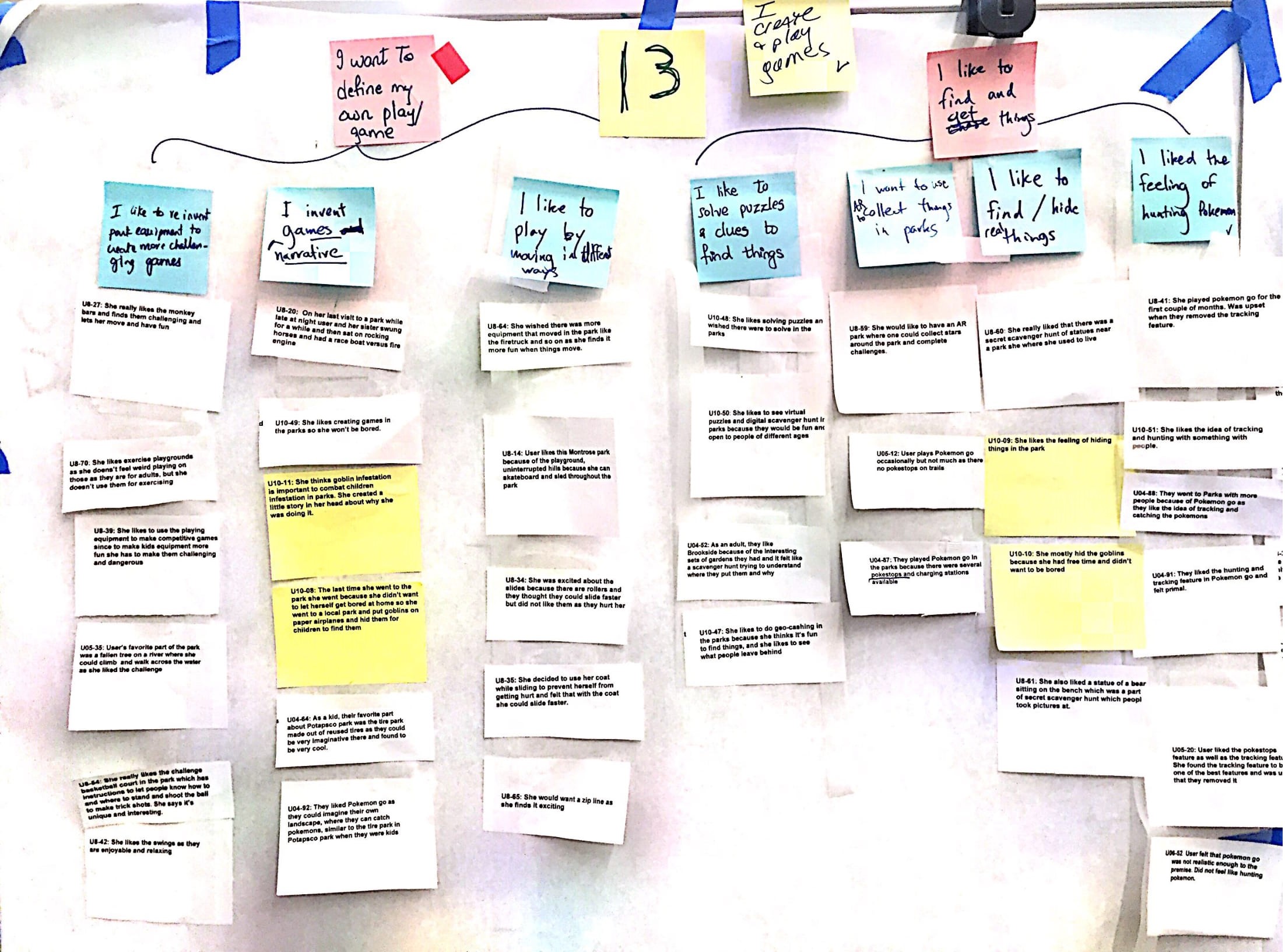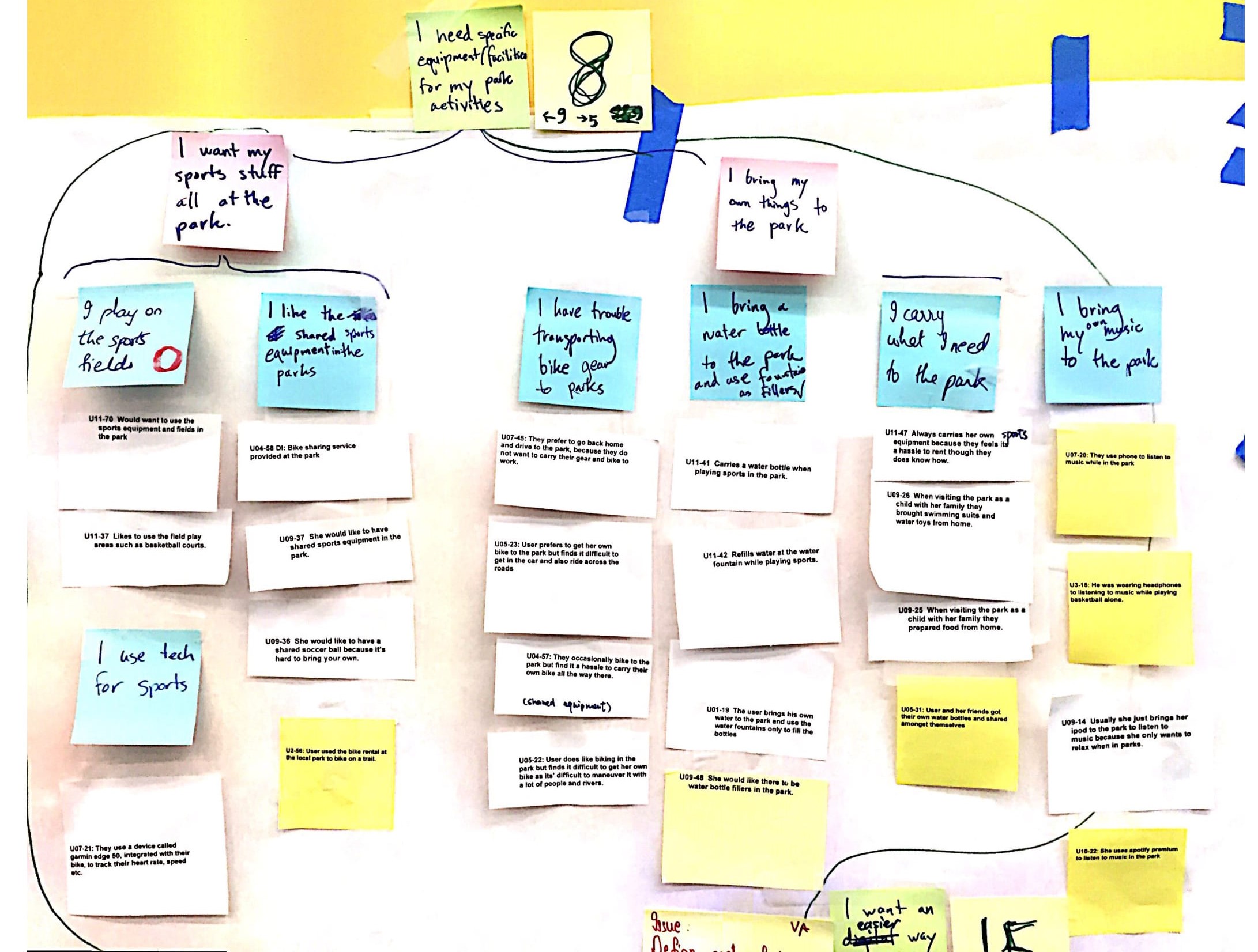 After each interview, we conducted interpretation sessions to capture notes and experience models for each of our users. We collected over 700 notes to construct our affinity model in a bottom to top hierarchy. We used the yellow post-it for our interview notes, blue post-it for aggregate findings, pink post-it for strategic perspective for findings and green post-it for user needs and issues.