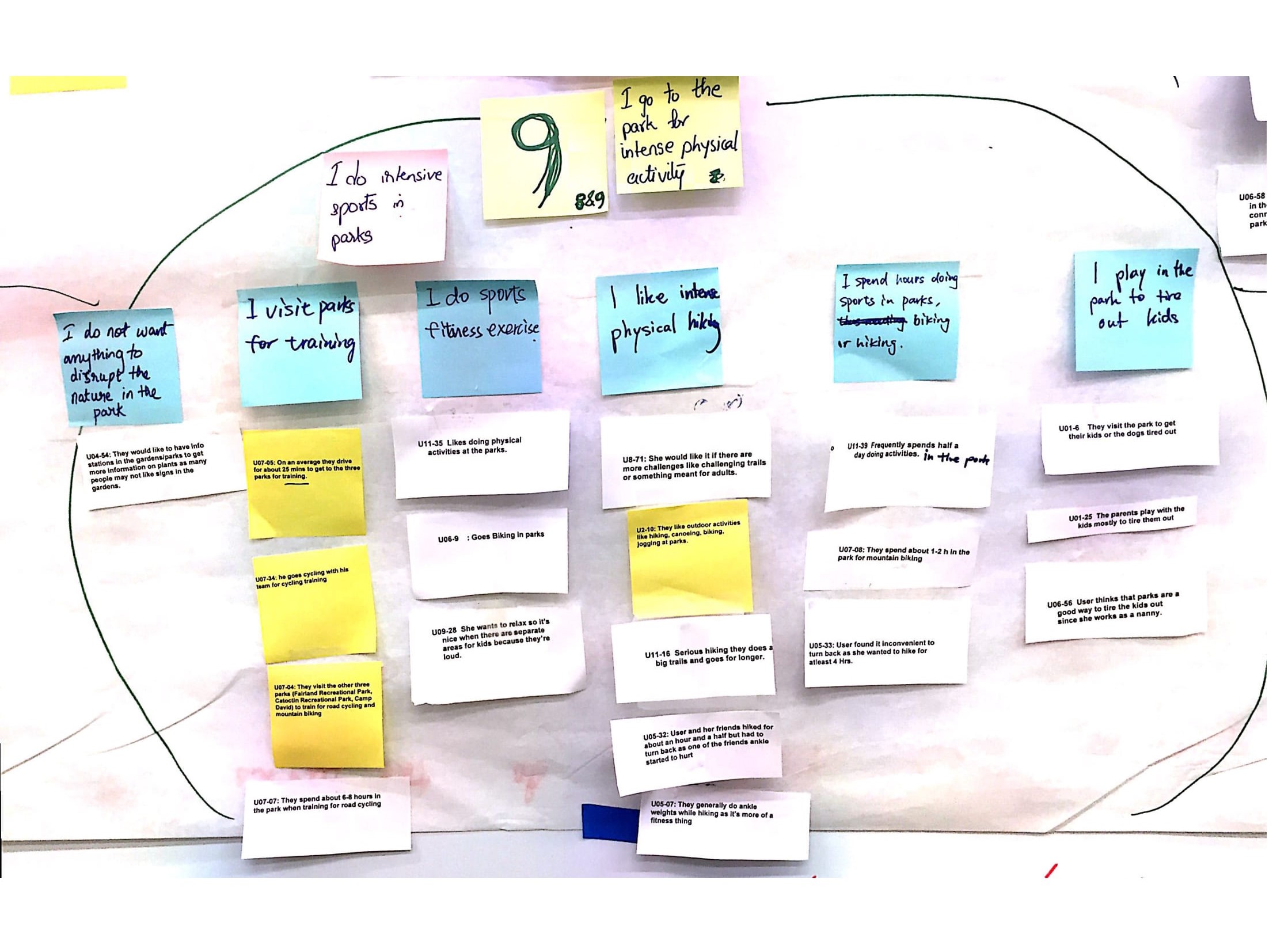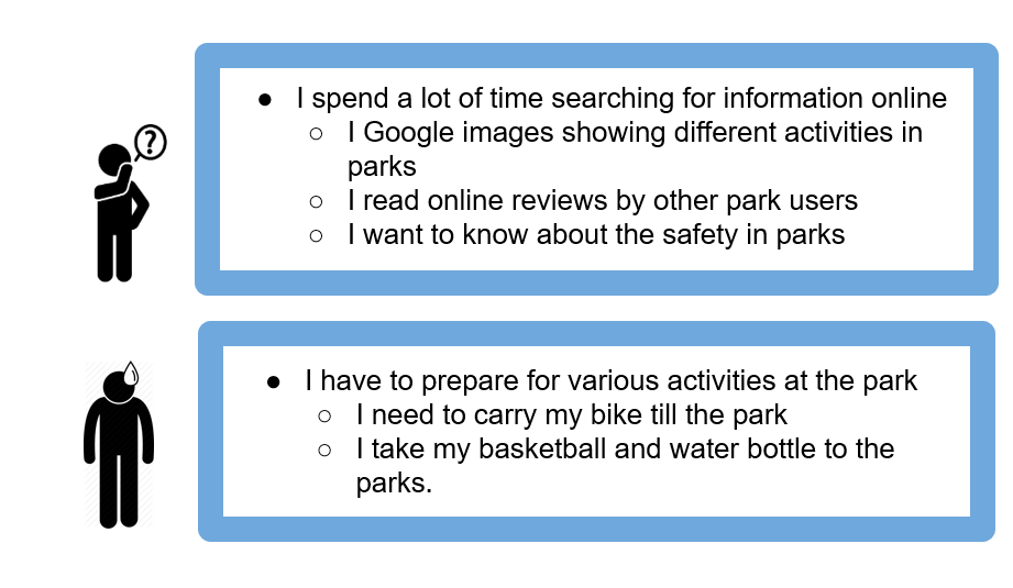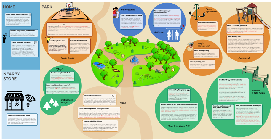 We conducted 2 hour deep contextual interviews with millennials. We met the users near their homes and travelled with them to the parks. I focused on gathering information about ongoing user experience as opposed to summary data. While asking users about retrospective accounts, I focused on concrete data rather than abstract. I used the apprentice(me)/master(interviewee) relationship model in observing user behavior along with probing to understand underlying aspects of their activities.