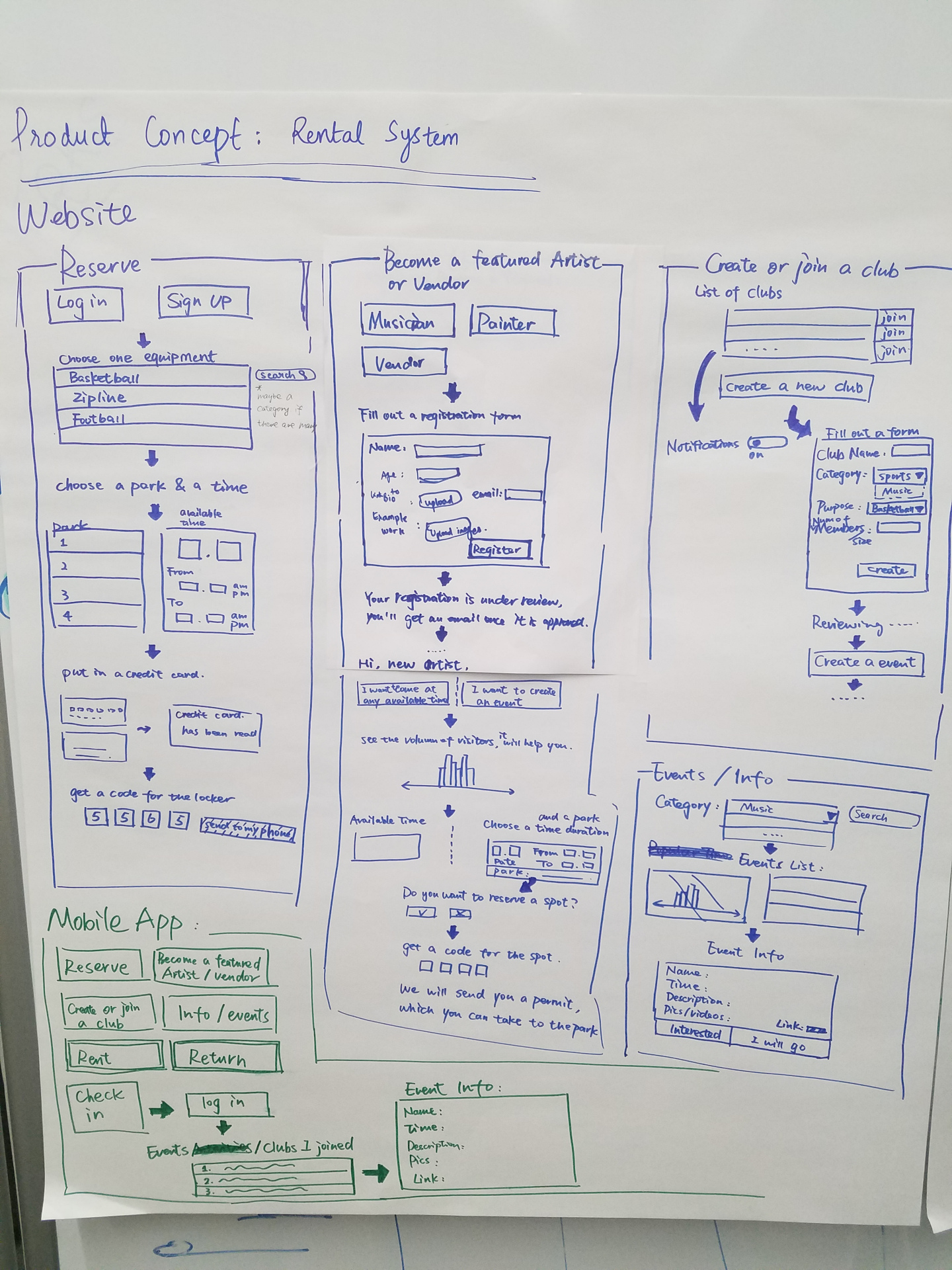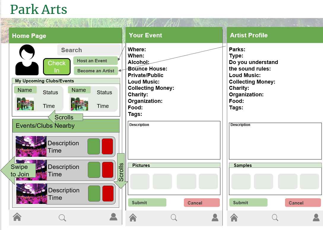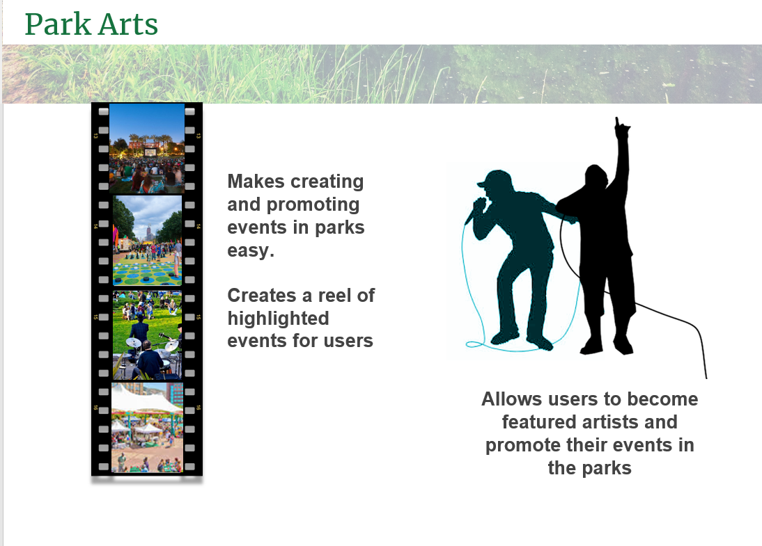3. Parks Arts System: To provide users with an excuse to hang out with their friends outdoors, we created Parks Arts System. We found that the park users and non-users both are interested in outdoor activities as seen through our community space enthusiast identity. The Park Arts mobile app will deliver a social experience of visiting music, theatre and art events to users. It will also allow users to create events at parks and share them with park patrons and friends. We also addressed the business requirement of modernizing the event submission at parks. Overall this will increase awareness of the parks.