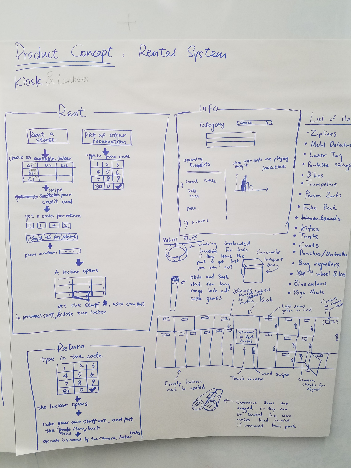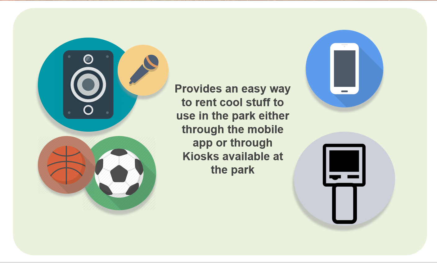 2. Parks Rental System: Millennials want “low preparation visits” to parks. We found that they view parks as places to play, hike and carry out various activities with friends mostly. The rental system provides a centralized equipment loan service with an app and kiosk interface. There will be smart lockers at parks for easy renting and returning of play equipment.
