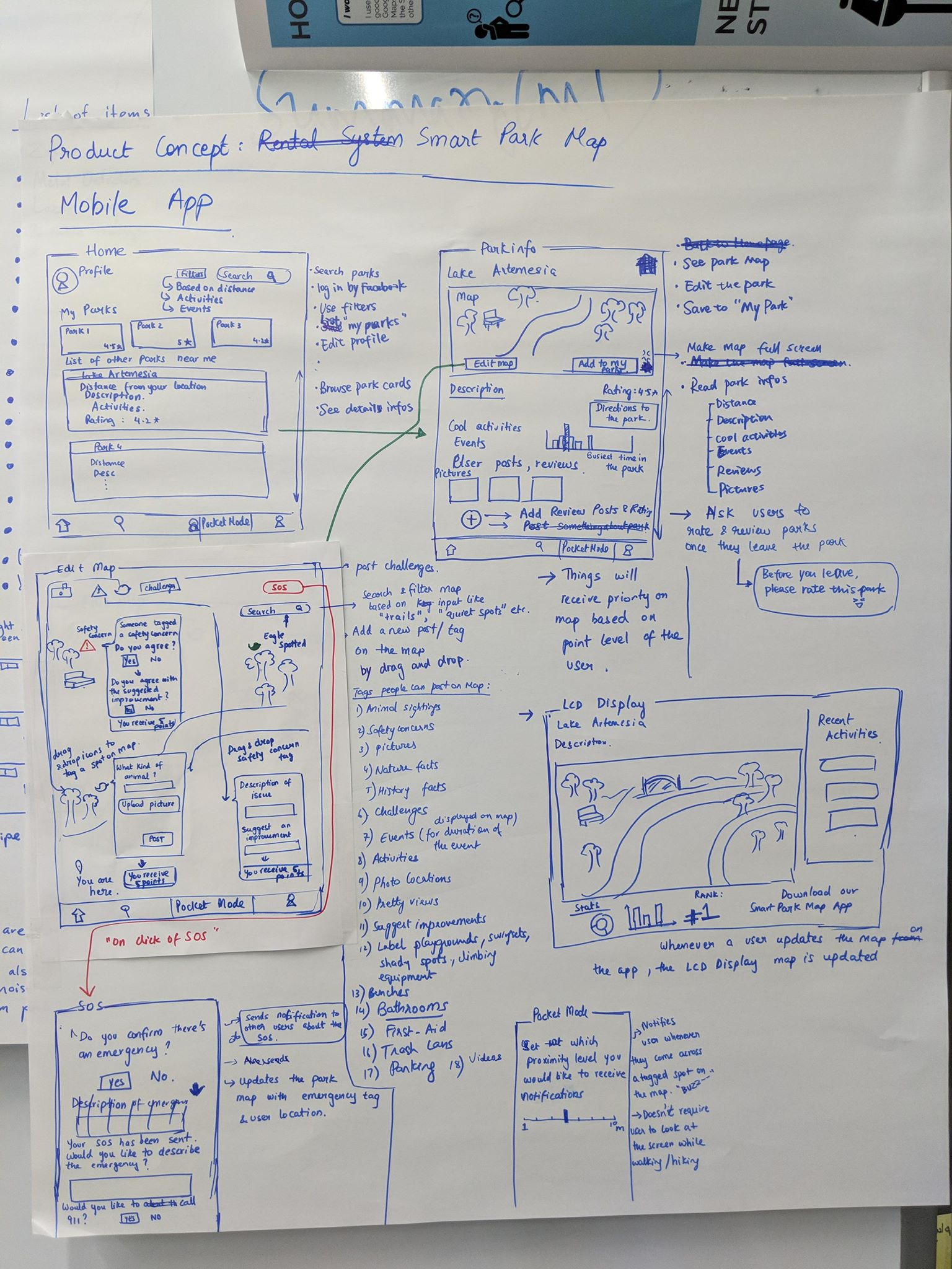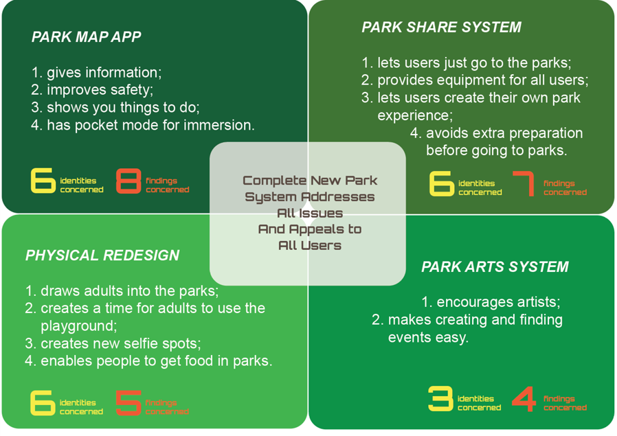 1. Park Map App: Addressing issues like social experience and tranquility, information about parks and facilities in parks, creating-viewing-sharing content in parks, tagging parks with cool activities to improve park's brand and awareness, we propose a mobile app. The app also provides an SOS feature to call park staff, handsfree immersion mode to guide user through the interesting things in the park through location detection and voice.