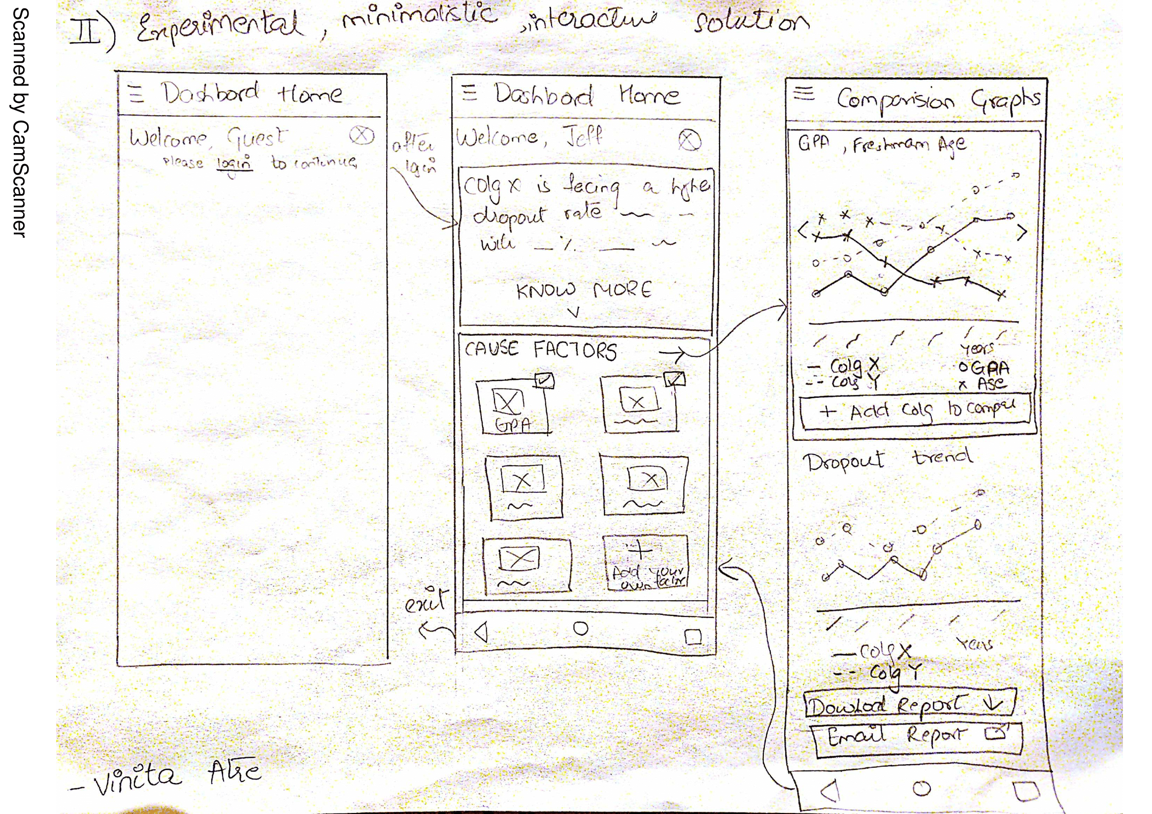 The thinker-collaborative type dashboard consists of 3 screens which are Home page, Comparison Graphs page, and Generate Report Page. The Home explains the problem by displaying the crucial factors for the college and the dropout trend. It allows user input for probable causes. The Comparison Graphs page shows the data form the cause factors in graphs. The dropout trend over time is presented as an overlay at the bottom at all times. This allows easy comparing and as well as cause-effect analysis. To allow collaboration, the Generate Reports page provide a checklist of items to be added to the report along with section for comments which can then be sent to the right people by just using their names.